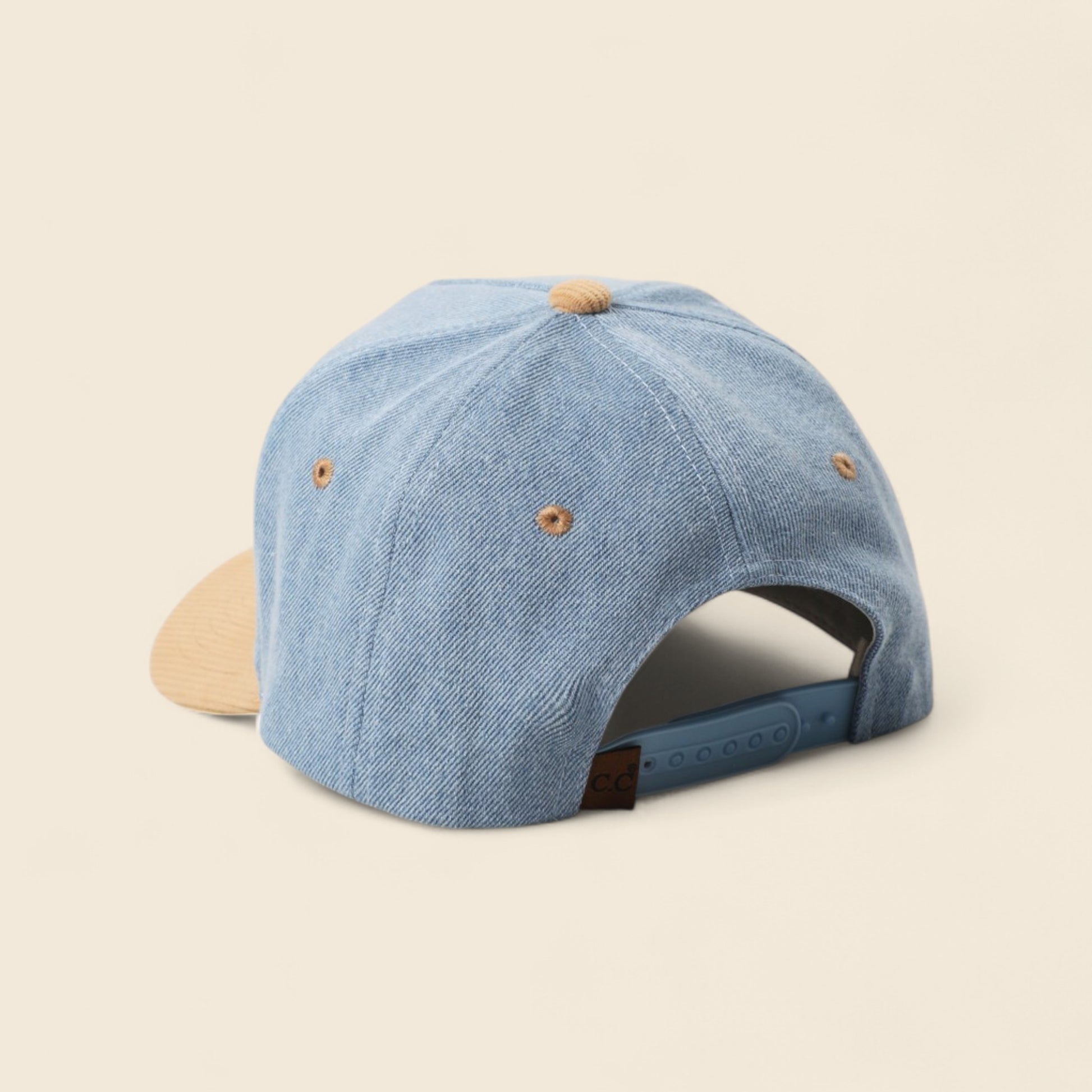 Designed with a light-denim crown and tan corduroy brim, this statement cap brings retro energy to any outfit.